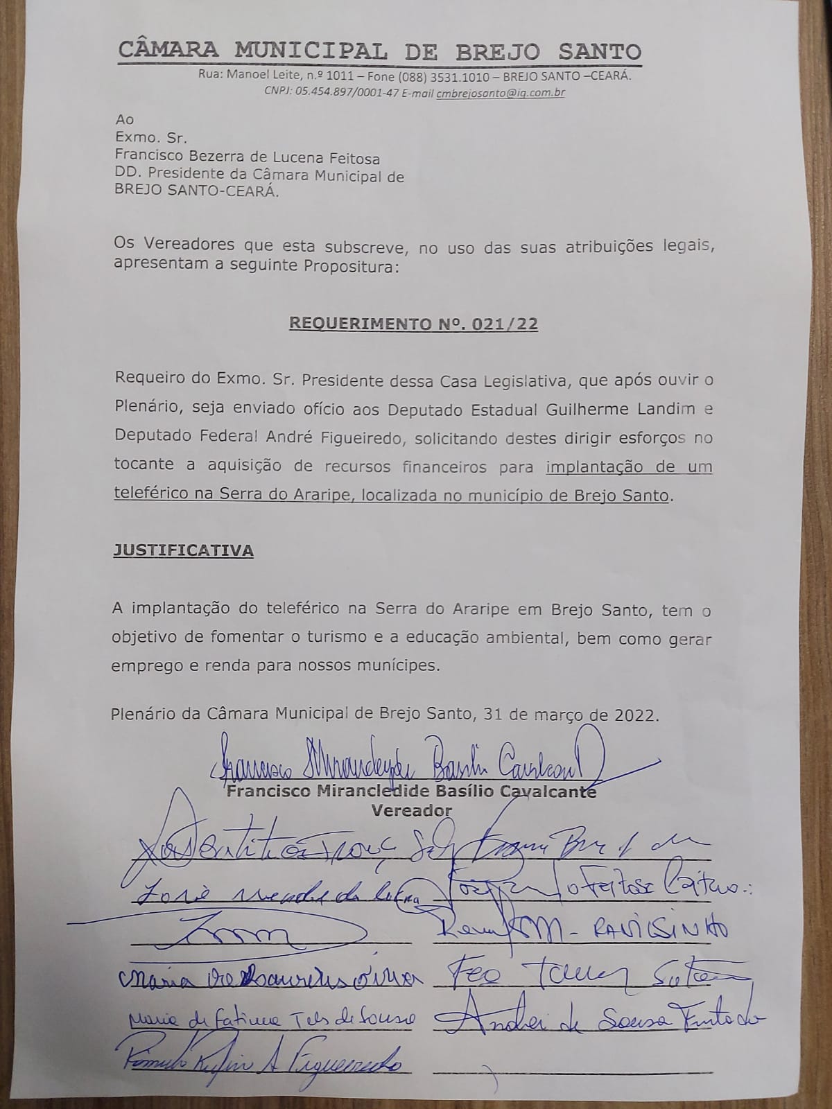 Na Sessão Ordinária desta quinta-feira, 31 de março, o Vereador Miran Basílio apresentou o Requerimento N° 021/2022, que após ouvir o Plenário, seja enviado ofício ao Deputado Estadual Guilherme Landim e ao Deputado Federal André Figueiredo, solicitando destes dirigir esforços no tocante a aquisição de recursos financeiros para implantação de um Teleférico na Serra do Araripe, localizada no município de Brejo Santo.