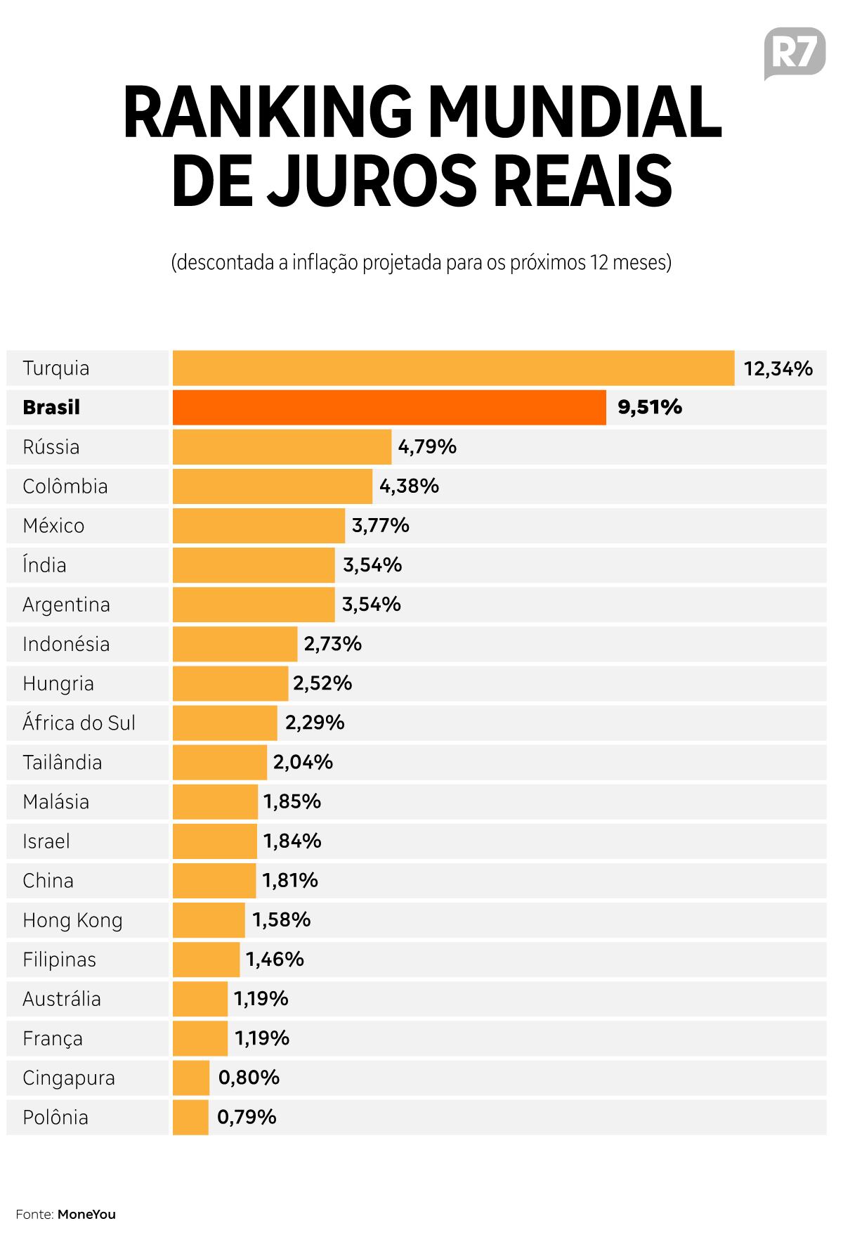 O Brasil voltou à segunda colocação no ranking global de juros reais, atrás da Turquia e à frente de Rússia e Colômbia. Segundo cálculo feito pela MoneYou, a taxa real de juros no país atualmente é de 9,51%.