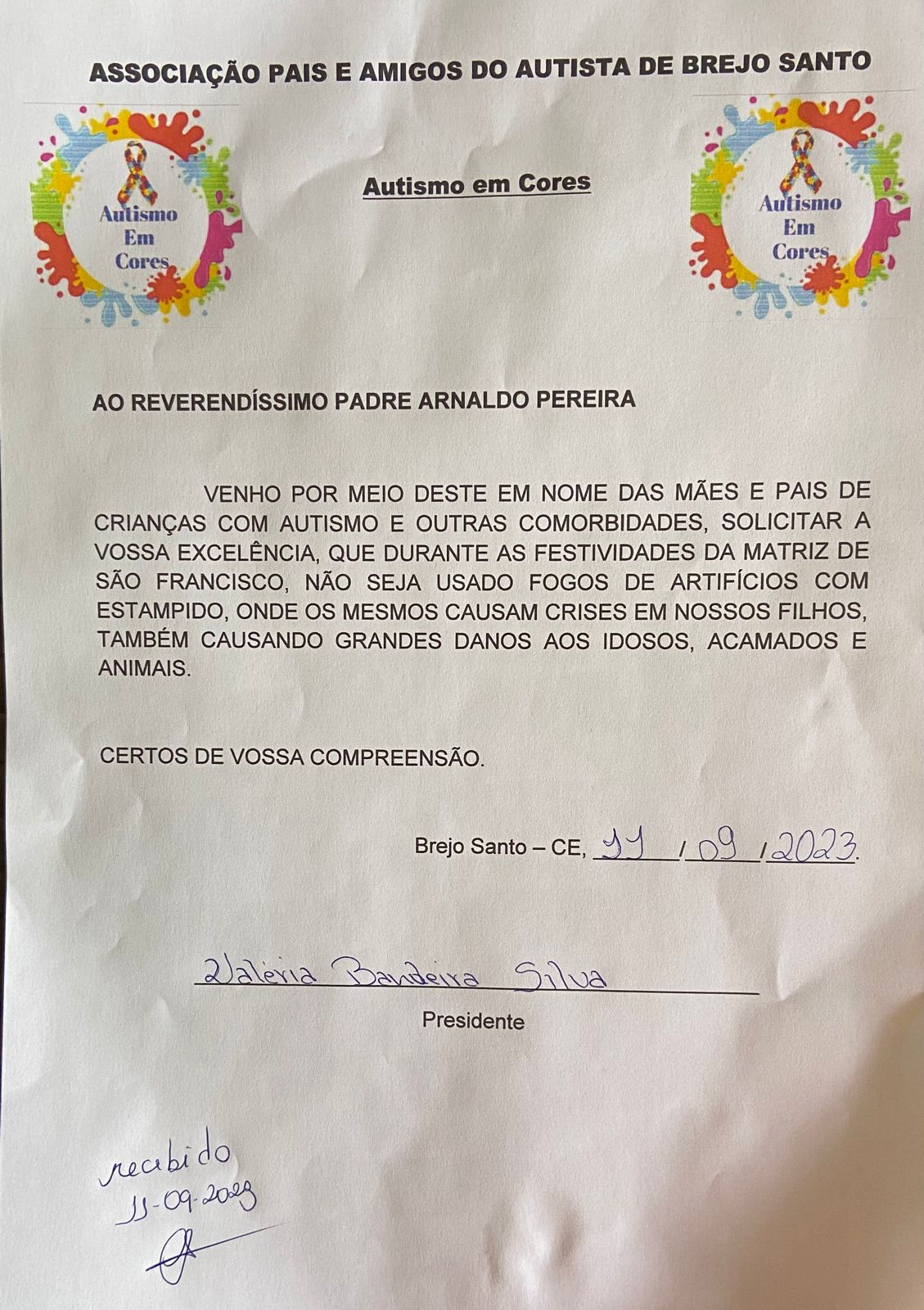 Brejo Santo: Associação de Autistas pede que não haja fogos com estampido em festa religiosa Locais J Cabral 12 de setembro de 2023 Leia na integra o oficio recebido abaixo: