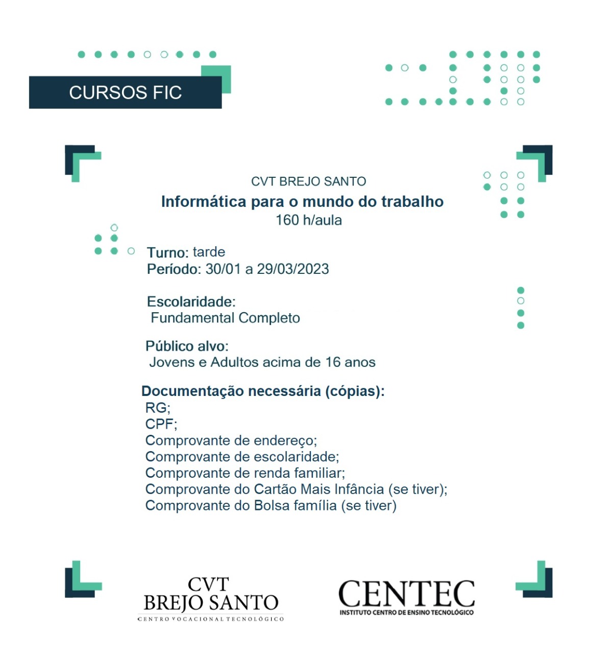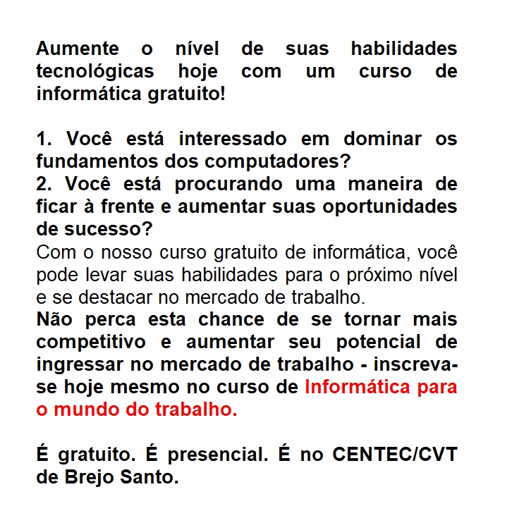 Brejo Santo: CVT abre inscrições para curso de computação. Locais J Cabral 25 de janeiro de 2023 Inscrições neste site: centec.org.br/aulas-online-cvt Fonte: CVT.