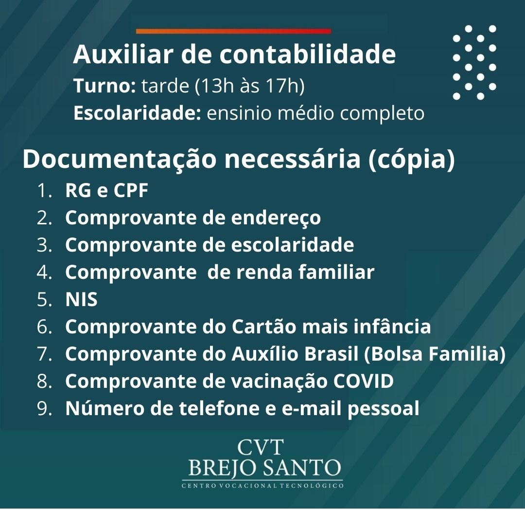 * Auxiliar de Contabilidade no CVT/Comunidade do Alto da Bela Vista.