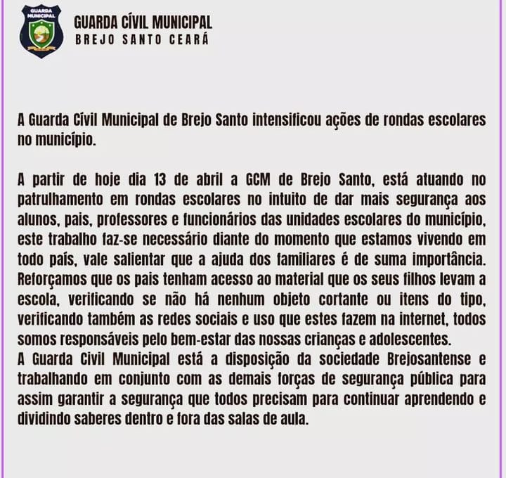 Brejo Santo: Guarda Municipal lança nota sobre segurança nas escolas.