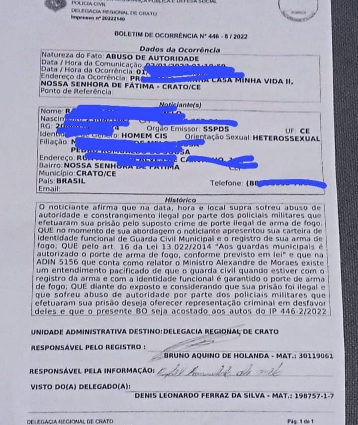 Um Guarda Municipal da Cidade de Juazeiro do Norte CE é conduzido até autoridade Policial na Cidade de Crato/CE, por porte ilegal, mas a Composição da PM (Policia Militar) poderá responder por abuso de autoridade.