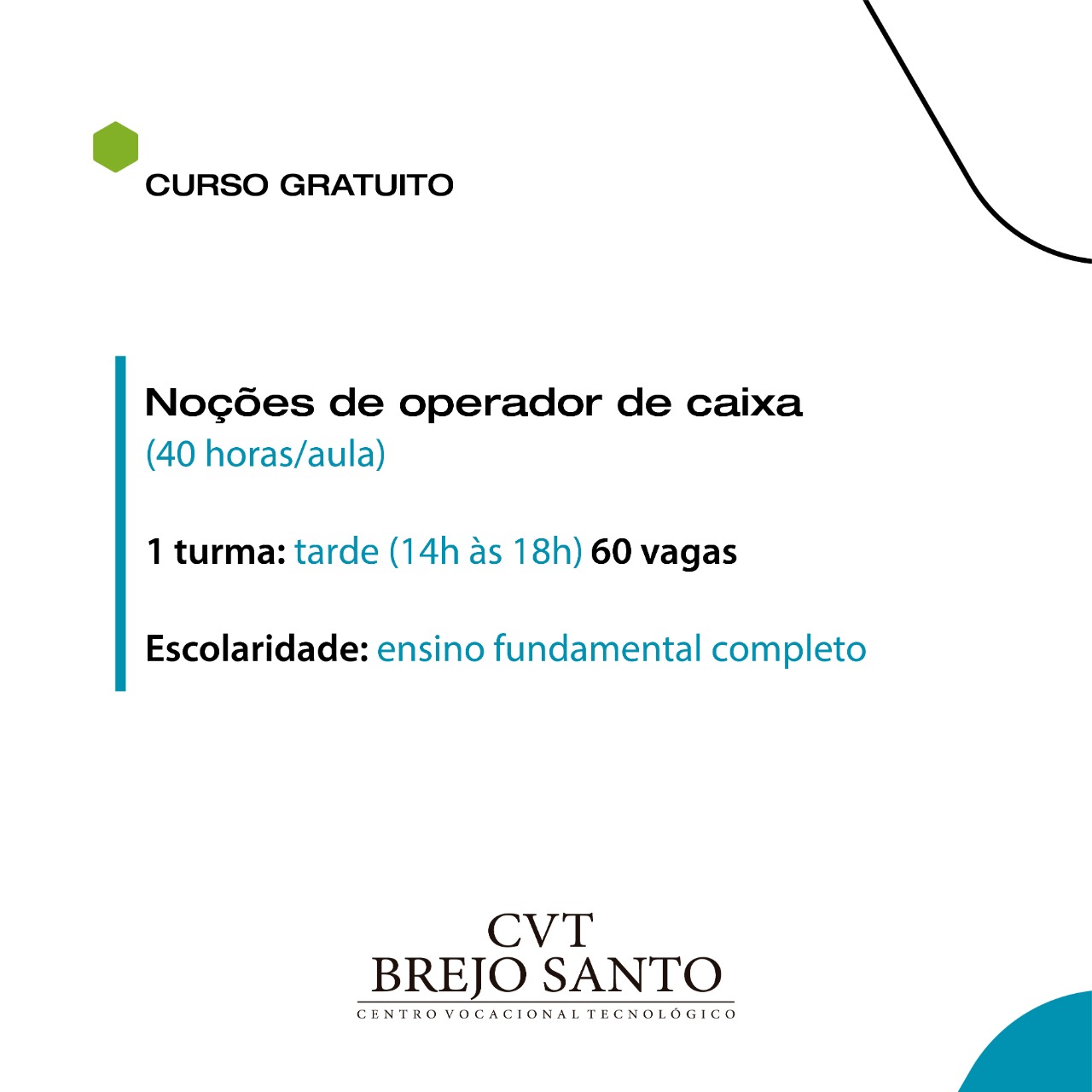 CVT de Brejo Santo-CE, abre inscrição neste dia 13 de abril de 2021 para o curso de : NOÇÕES DE OPERADOR DE CAIXA.
