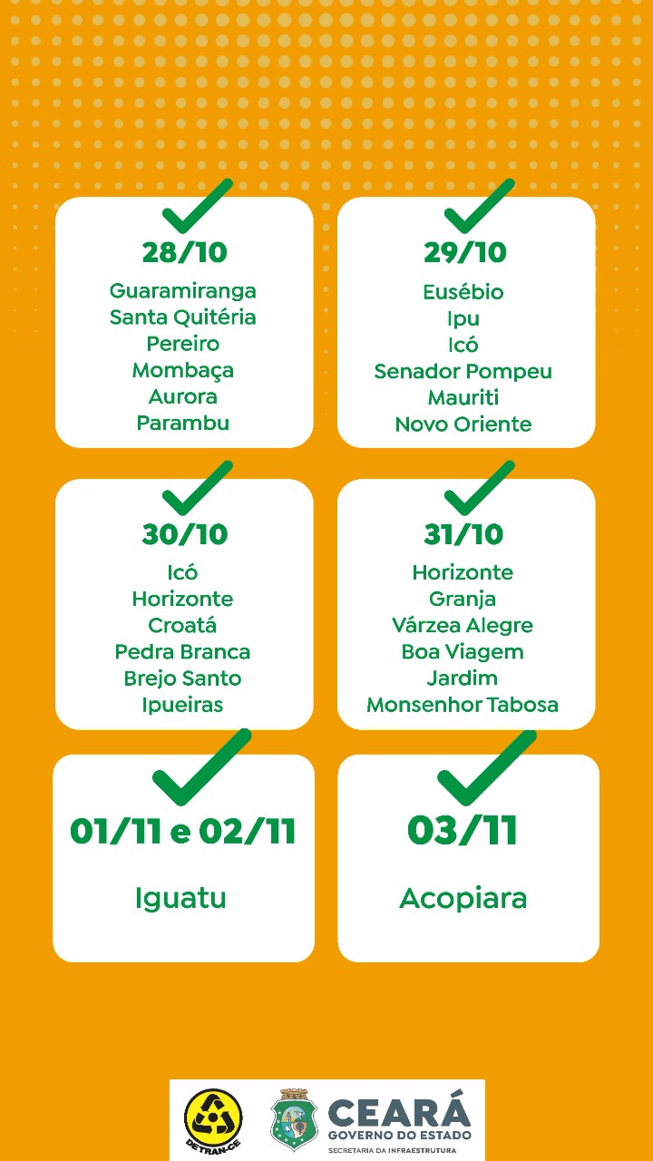 *O Detran-CE ressalta que divulgará, posteriormente, os endereços e horários de atendimentos em cada município, assim como o calendário das próximas comissões nas demais cidades.