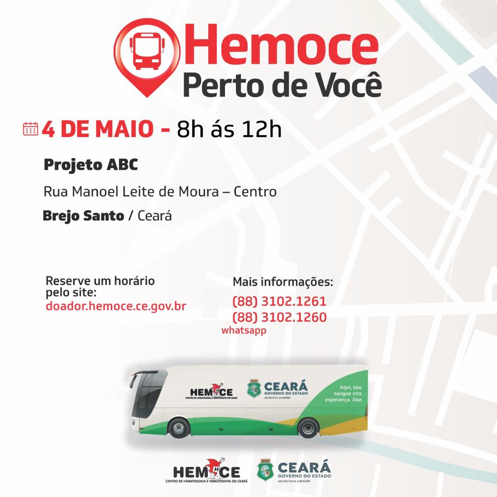 Neste dia 04/MAIO quarta-feira tem doação de Sangue do HEMOCE, em parceria com Prefeitura Municipal de Brejo Santo/CE.