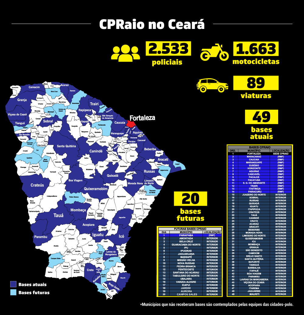 O Ceará conta, a partir desta quinta-feira (30), com uma nova unidade do Comando de Policiamento de Rondas e Ações Intensivas e Ostensivas (CPRaio), desta vez instalada em Mauriti, na Região do Cariri. Com esta, já são 49 municípios contemplados com o CPRaio em todas as regiões do Estado. A segurança na cidade ganha também o apoio de 14 câmeras do Sistema de Videomonitoramento. Já são 47 centrais de videomonitoramento no Ceará, totalizando 3.333 câmeras. Além da Capital, são 13 bases do CPRaio na Região Metropolitana de Fortaleza (RMF) e 35 no Interior.
