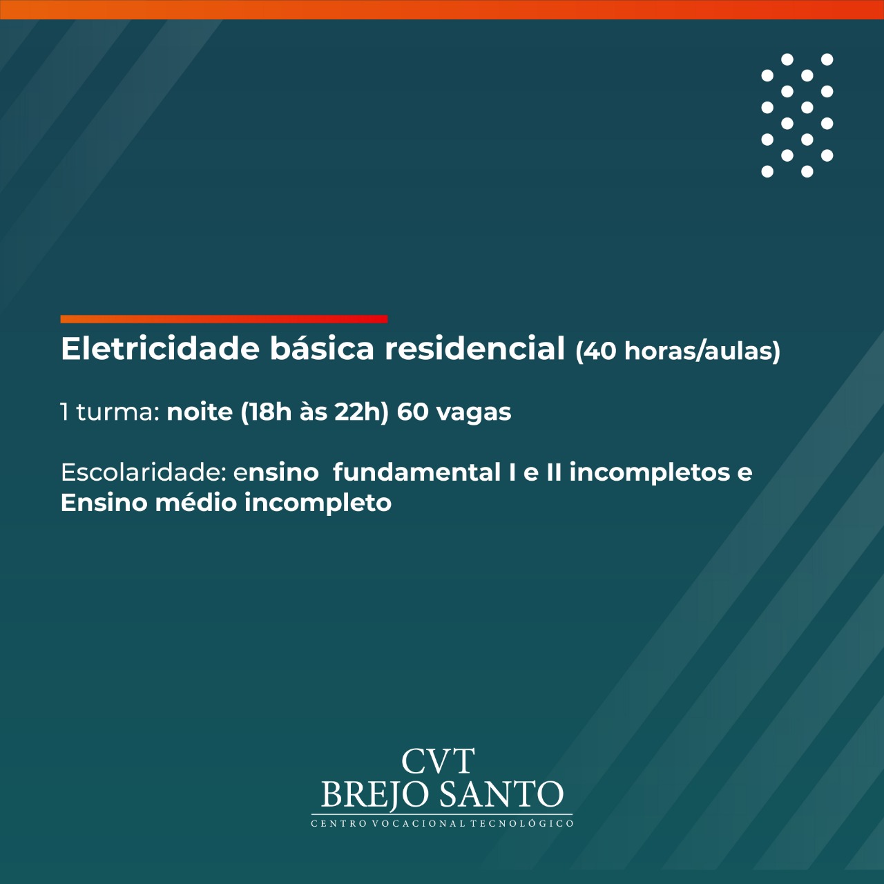 O CVT DE BREJO SANTO, ABRE INSCRIÇÕES HOJE DIA 28 DE JUNHO , DE UM NOVO CURSO DE ELETRICIDADE BÁSICA RESIDENCIAL. GRATIS.