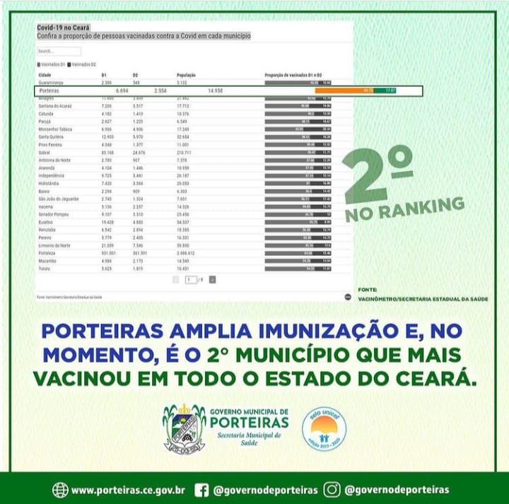 Depois de alcançar excelentes números em meta de Vacinação contra a Covid-19, aparecendo em 1° lugar entre os municípios do Cariri, Porteiras amplia imunização e, no momento, é o 2° município que mais vacinou em todo o Estado do Ceará, ficando à frente de 182 cidades no ranking.