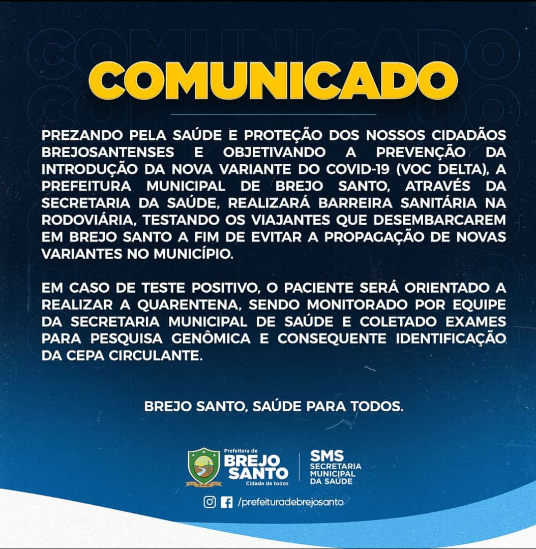 A Prefeitura Municipal de Brejo Santo, por intermédio da Secretaria de Saúde lançou um comunicado em suas redes sociais o mesmo diz: